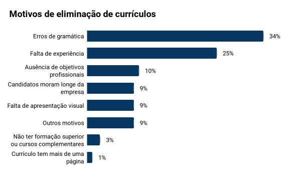 A análise ainda apontou outros fatores que fazem com que um currículo seja descartado imediatamente. Segundo os profissionais de Recursos Humanos, os motivos para eliminação são: 25% por falta de experiência, 10% por ausência de objetivos profissionais e 9% porque os candidatos moram longe da empresa.