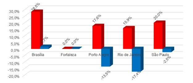 No relatório atual, o destaque no acréscimo do valor do seguro fica para Brasília, que obteve aumento de 28,5% para o perfil feminino. Em todos os municípios estudados há elevação nos preços para as condutoras, como mostra o gráfico abaixo, porém no Rio de Janeiro esse impacto foi menor, embora ainda bastante significativo, com aumento de 15,9% no preço médio da apólice para as mulheres. A cidade de Fortaleza é a única que apresenta o índice zerado, pois figura pela primeira vez no levantamento.