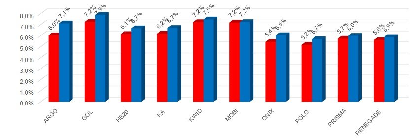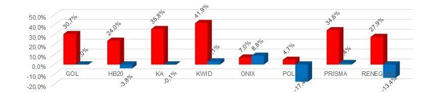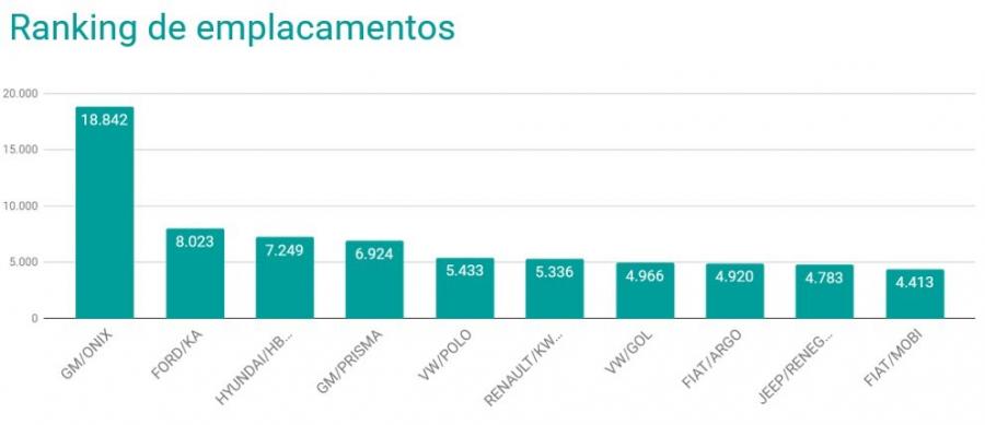 Dos dez veículos analisados neste estudo, oito são os mesmos de janeiro. Após figurarem no levantamento do último mês, os automóveis Toyota Corolla e Hyundai Creta saem do relatório e dão espaço para o Fiat Argo e o Fiat Mobi, que não apareciam na lista dos 10 mais emplacados desde novembro e junho, respectivamente.