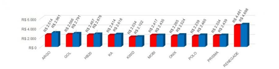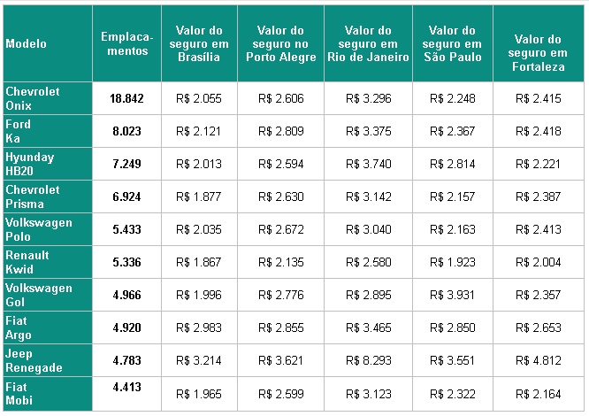 O Chevrolet Onix segue como o carro mais emplacado no Brasil, com 18.842 unidades em janeiro ante 8.023 registradas para o segundo colocado, o Ford Ka. O preço médio do seguro do modelo de entrada do Onix para o sexo masculino custa atualmente R$ 2.524, contra R$ 2.319, registrado no estudo anterior. Já para o perfil feminino, o valor médio atual é de R$ 2.265 ante R$ 2.117 calculados na cotação do mês anterior.