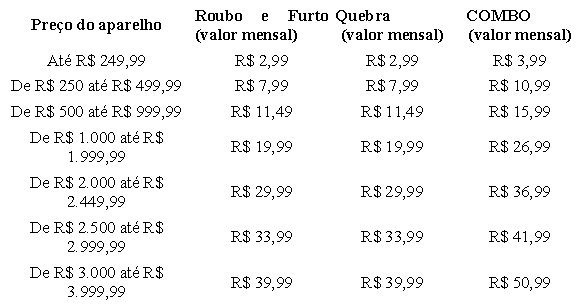 Os pacotes variam de R$ 2,99 até R$ 57,99 por mês, de acordo com o valor do aparelho e a modalidade escolhida. Está disponível ainda o plano básico, com cobertura de até R$ 500 para reposição do aparelho em caso de furto ou roubo, independentemente da faixa de valor do modelo segurado.