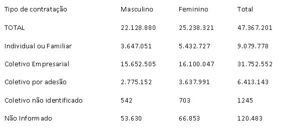 Tabela 1 - Número de beneficiários em planos de assistência médica por tipo de contratação, de acordo com o sexo