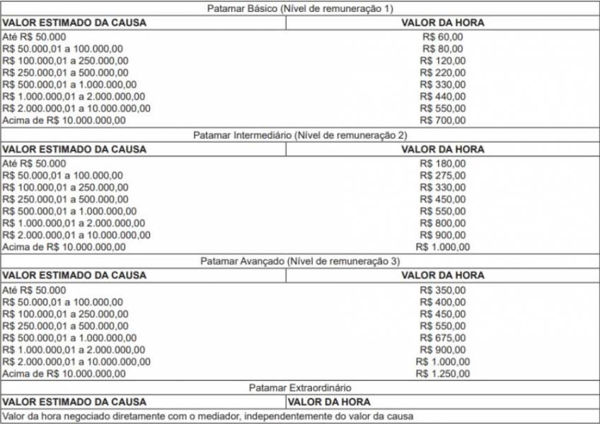 O documento determina níveis de remuneração conforme o patamar do mediador, que são denominados como voluntário, básico, intermediário, avançado e extraordinário. No primeiro nível não há remuneração estipulada, tendo em vista que a mediação é voluntária. Já no último, o valor da hora é estipulado pelo próprio mediador, independente do valor da causa.