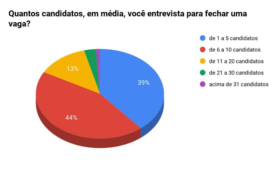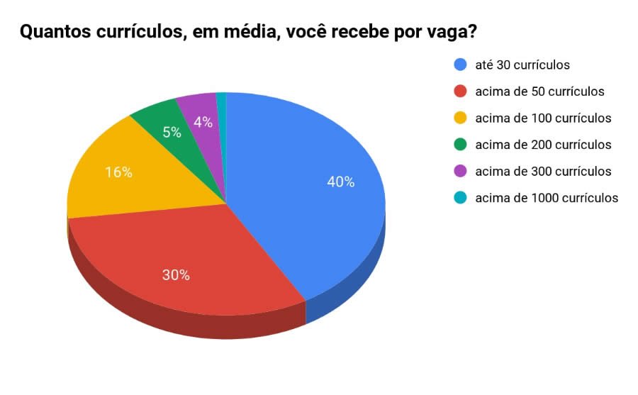 Esse número fica mais expressivo ao se observar quantos profissionais se candidatam por vaga e, consequentemente, quantos currículos os recrutadores recebem. Ainda segundo o levantamento, 44% dos entrevistados recebem até 30 currículos, 30% mais de 50 e 16% mais de 100.