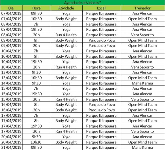 Para celebrar a data estimulando os paulistanos a deixar o sedentarismo de lado, a Central Nacional Unimed vai promover aulas gratuitas de ioga, funcional e de corrida nos parques do Povo e Ibirapuera durante todo o mês de abril. As primeiras aulas ocorrerão a partir de domingo e a inscrição deve ser feita pelo aplicativo Mude Fit.