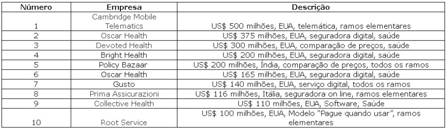 Abaixo, a lista dos 10 maiores investimentos no segmento em 2018. Na primeira coluna, o nome da empresa. Na segunda coluna, a descrição (valor, país, objetivo e ramo de seguros).