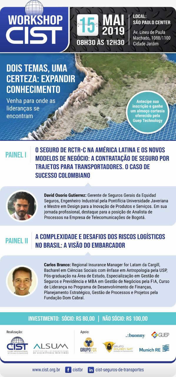 O Clube Internacional de Seguros de Transportes (CIST) vai promover um workshop com o tema “Entenda como funcionam as questões de riscos e seguros do Transporte de Cargas na América Latina”. O evento, destinado aos profissionais dos setores de seguros e logística, será realizado no dia 15 de maio, no São Paulo Center.
