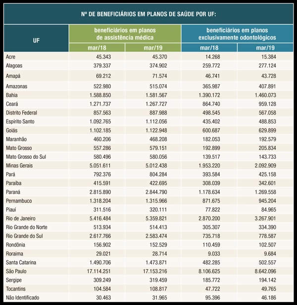 Em março, o setor contabilizou 47.053.184 beneficiários em planos de assistência médica e 24.479.494 em planos exclusivamente odontológicos. Na segmentação assistencial, é verificada estabilidade em relação ao mesmo período do ano anterior. No recorte por Unidade Federativa, 14 estados e o Distrito Federal registraram crescimento no período de um ano, sendo São Paulo, DF, Paraná, Mato Grosso e Goiás, nesta ordem, os cinco com o maior ganho de beneficiários em planos de assistência médica, em números absolutos.