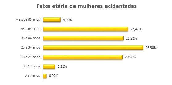 Apesar da baixa participação das mulheres em acidentes de trânsito, as jovens de 18 a 34 anos são as mais atingidas quando as colisões acontecem. A faixa etária, considerada a população economicamente ativa, concentrou 47% dos pagamentos destinados às vítimas mulheres. O segundo grupo de idade mais afetado integra as mulheres de 45 a 64 anos (22%).