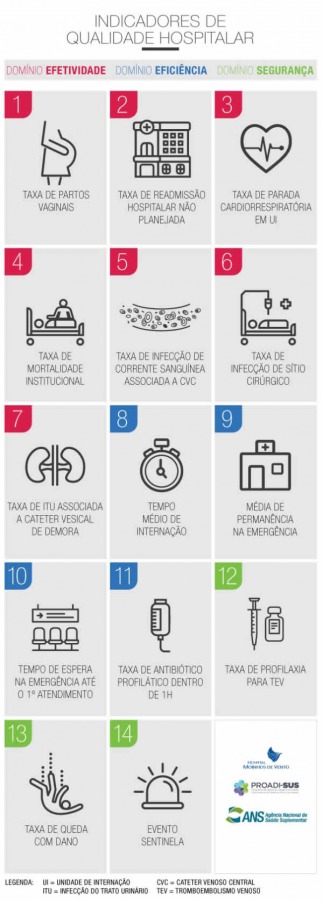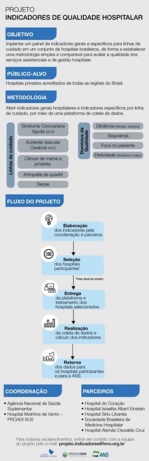 A Agência Nacional de Saúde Suplementar (ANS), em parceria com o Hospital Moinhos de Vento (HMV) e por meio do programa Proadi-SUS, está desenvolvendo o projeto Indicadores de Qualidade Hospitalar, iniciativa pioneira que irá avaliar o desempenho das instituições hospitalares privadas do país. O projeto vai atualizar e ampliar o monitoramento dos resultados em saúde para abranger linhas de cuidado através de uma ferramenta de coleta de dados padronizada. O propósito é criar um sistema único de avaliação da qualidade das instituições que permita comparabilidade, identificação de boas práticas e pontos de aprimoramento, desenvolvimento de políticas baseadas em desempenho e disponibilidade de informações para a sociedade, possibilitando maior poder de decisão sobre os serviços hospitalares disponíveis.