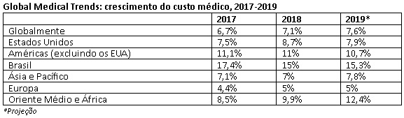 Espera-se que os custos do benefício de assistência médica fornecido pelos empregadores aumentem modestamente em todo o mundo em 2019, de acordo com uma pesquisa realizada pela Willis Towers Watson com seguradoras que atuam no segmento de saúde. Segundo as seguradoras pesquisadas, o alto custo da tecnologia médica, o uso excessivo e a prescrição excessiva de serviços são os principais responsáveis por esse aumento. Segundo o estudo Global Medical Trends 2019, o maior desse tipo no setor, as seguradoras de saúde estão projetando para 2019 um aumento de 7,6% do custo médico globalmente, um aumento pouco maior que os 7,1% de 2018. No Brasil, esse índice deve ser de 15,3%, quase quatro vezes a taxa geral de inflação.