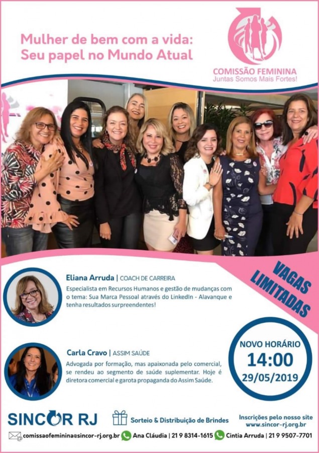 Para participar, é só entrar em contato através dos telefones (21) 98314-1615 (Ana Claudia), (21) 99507-7701 (Cintia Arruda) ou através do e-mail ou pelo site www.sincor-rj.org.br O encontro conta com sorteio de brindes.
