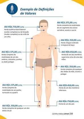 Outro destaque do material é a tabela prevista na Lei 6.194/74 (alterada pela Lei 11.945/2009) e alguns exemplos de aplicação da legislação, que são, inclusive, demonstrados em um infográfico na página 15. A tabela serve de base para o cálculo dos valores das indenizações, que variam de acordo com a gravidade da lesão que levou à sequela definitiva, classificada como total ou parcial (completa ou incompleta).
