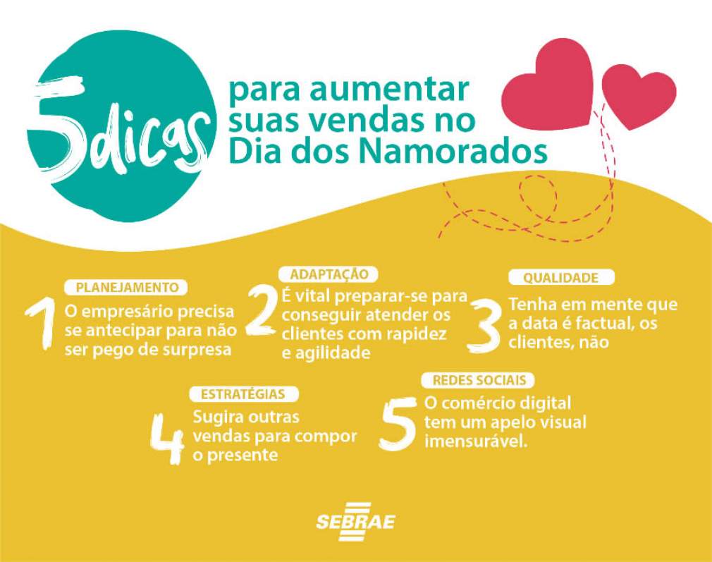 O empresário precisa se antecipar para não ser pego de surpresa. Além dos presentes, os casais preparam uma celebração, que impacta no aumento das reservas nos restaurantes, por exemplo. O segmento de artigos e enfeites também vê a demanda crescer na ocasião. Portanto, no caso de uma loja de roupas, por exemplo, ficar atento ao estoque, variar o mix de produtos e oferecer condições especiais de pagamento e troca, são alguns dos benefícios que podem atrair os clientes para o seu negócio.