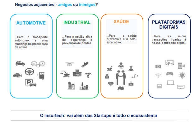 Essas tecnologias estão sendo exploradas pelos novos participantes do setor, desde as startups até as empresas de setores adjacentes que podem entrar no ramo de seguros.