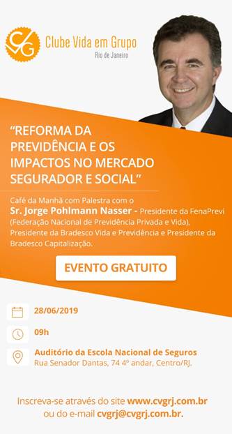O Clube Vida em Grupo do Rio de Janeiro (CVG-RJ) vai contar com a presença do presidente da FenaPrevi, Jorge Nasser, em café da manhã a ser realizado no dia 28 de junho, a partir das 9h. O tema do encontro será a Reforma da Previdência e os seus impactos no mercado segurador, bem como na sociedade em geral.