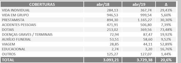 No mês de abril as contratações tiveram também um crescimento expressivo. O valor, que se refere às contratações de coberturas para riscos pessoais foram 20,6% superiores e o prêmios foram de R$ 3,73 bilhões.