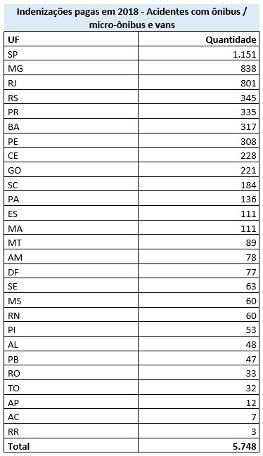 Em relação aos números regionais, mais de 20% das indenizações relativas aos veículos da categoria 3 foram destinadas às vítimas de São Paulo, que lidera o ranking dos estados com maior índice de pagamentos em acidentes envolvendo ônibus, micro-ônibus e lotações, com 1.151 indenizações. Logo depois aparecem Minas Gerais (838) e Rio de Janeiro (801).