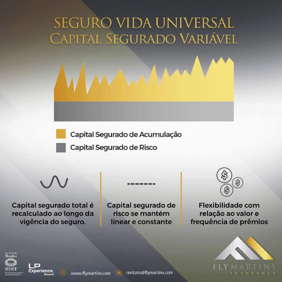Já na modalidade Capital Segurado Variável, o capital segurado total da apólice será equivalente à soma do capital segurado de risco e do capital de acumulação, ou seja, o capital segurado total sofre variações ao longo da vigência do seguro e o capital segurado de risco permanece linear.
