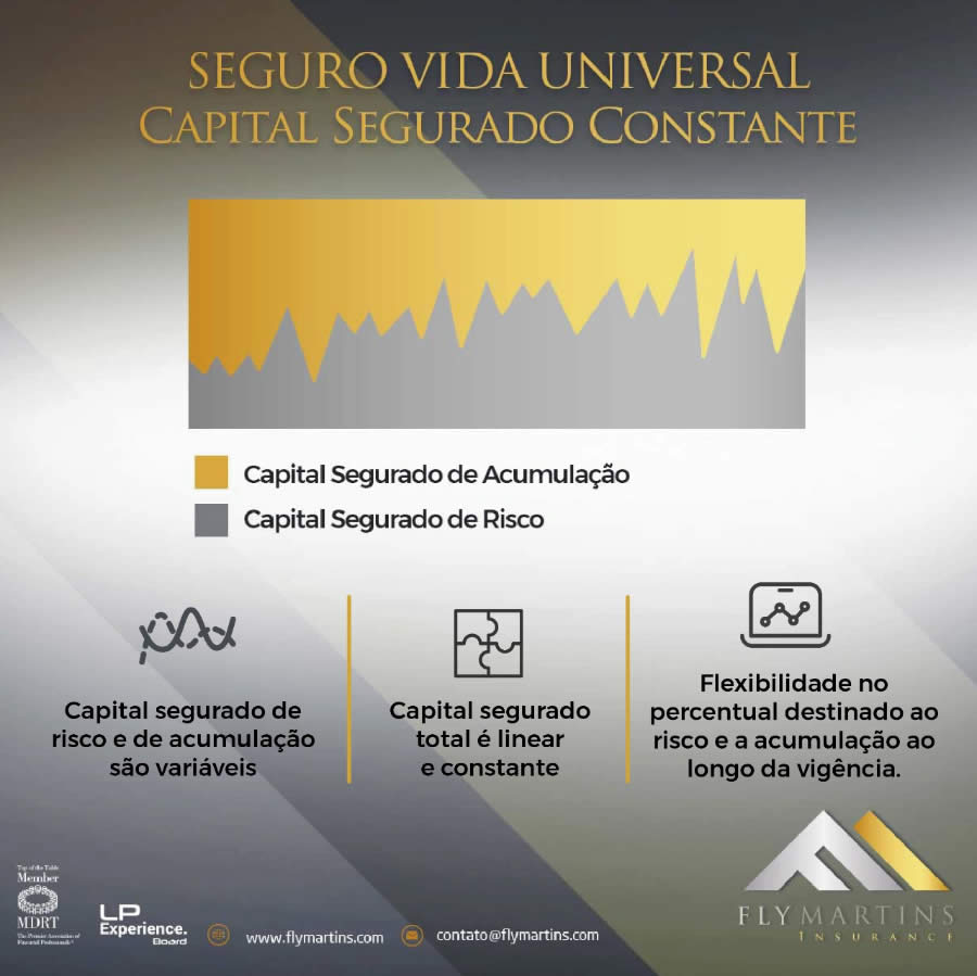 No Brasil, sabe-se que o Vida Universal será oferecido de duas formas: Capital Segurado Constante e Capital Segurado Variável. No Capital Segurado Constante, o capital segurado de risco é recalculado ao longo da vigência do seguro, em função da variação do capital segurado de acumulação, com o objetivo de que a soma de ambas as parcelas se mantenha equivalente ao valor do capital segurado inicial contratado. (Ilustração do gráfico)