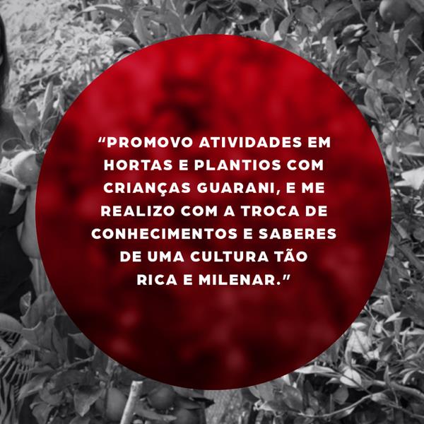 Já Sônia Regina de Aquino Rocha, de 54 anos, desenvolve uma ação de educação ambiental com outros voluntários junto a alunos das comunidades indígenas da etnia Guarani, moradores das aldeias vizinhas ao Parque Estadual do Jaraguá, na zona norte da capital paulista. O trabalho desenvolvido aborda plantios de horta, plantas medicinais, Plantas Alimentícias Não-Convencionais (PANCs), como fazer mudas etc, sempre com respeito à forma tradicional de plantio na cultura indígena.