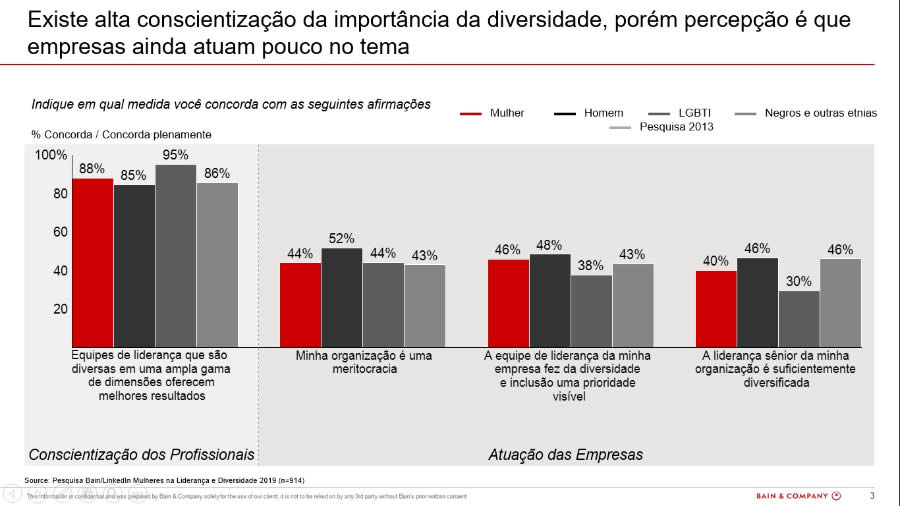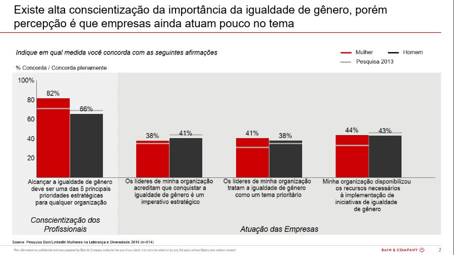 O estudo indica que, principalmente na percepção das mulheres, as empresas estão muito aquém de atuar de maneira satisfatória. Para 82% delas e 66% dos homens, alcançar a igualdade de gênero deveria ser uma das cinco principais prioridades para as companhias. No entanto, apenas 41% das mulheres e 38% dos homens afirmam que os líderes de suas organizações tratam a igualdade de gênero como tema prioritário. "As empresas devem entender o novo papel que precisam exercer perante as diversas demandas da sociedade. Elas têm a obrigação não somente de se comprometer com causas e iniciativas inclusivas, mas também de adotar postura proativa de propagação e consolidação dessas políticas", afirma Luciana Batista, sócia da Bain & Company.