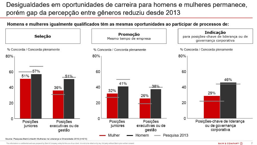 A desigualdade em oportunidades de carreira para homens e mulheres permanece, porém, a diferença da percepção entre os gêneros se reduziu desde 2013. Apenas para 36% das mulheres há igualdade nos processos de seleção para posições executivas ou de gestão. Entre os homens, o índice é de 51%. A diferença de percepção se mantém para oportunidades de promoção e indicação.