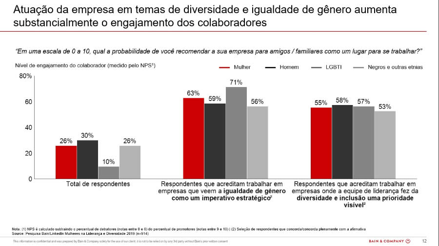 A atuação da empresa em temas de diversidade e igualdade de gênero aumenta substancialmente o engajamento dos colaboradores. Há empresas que estão desbravando esse caminho, reescrevendo seu legado e, como resultado, desfrutando dos benefícios oriundos dessa prática. Entre as mulheres ouvidas pela pesquisa, apenas 26% recomendariam a sua empresa para amigos ou familiares. Quando se estuda apenas o grupo que acredita trabalhar em uma organização com boas práticas igualitárias, esse índice sobre para 63%.