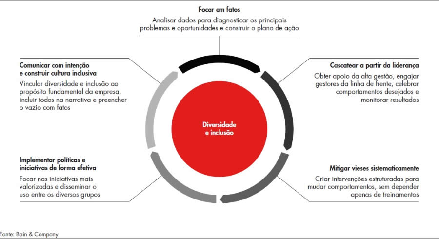 O estudo trouxe ainda cinco descobertas que servem como sugestão para aumentar a diversidade e inclusão nas empresas. São elas: focar em fatos; cascatear a partir da liderança; mitigar vieses sistematicamente; implementar políticas e iniciativas de forma efetiva; e por fim, comunicar com intenção e construir cultura inclusiva, vinculando diversidade e inclusão no propósito fundamental da empresa.