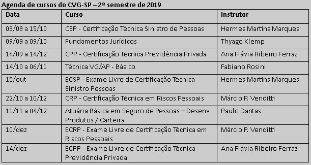 Entre outubro e novembro, o CVG-SP promoverá o curso CRP – Certificação Técnica em Riscos Pessoais, que está com inscrições abertas até 1º de outubro ou o término das vagas. Dia 11 de novembro começa o curso Atuária Básica em Seguro de Pessoas – Desenvolvimento de Produtos e Controle de Carteira, que termina no dia 4 de dezembro. As inscrições podem ser realizadas até 1º de novembro ou término das vagas.