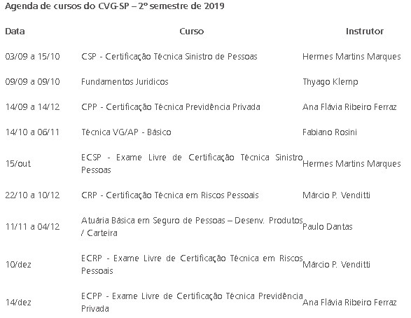 Entre outubro e novembro, o CVG-SP promoverá o curso CRP – Certificação Técnica em Riscos Pessoais, que está com inscrições abertas até 1º de outubro ou o término das vagas. Dia 11 de novembro começa o curso Atuária Básica em Seguro de Pessoas – Desenvolvimento de Produtos e Controle de Carteira, que termina no dia 4 de dezembro. As inscrições podem ser realizadas até 1º de novembro ou término das vagas.