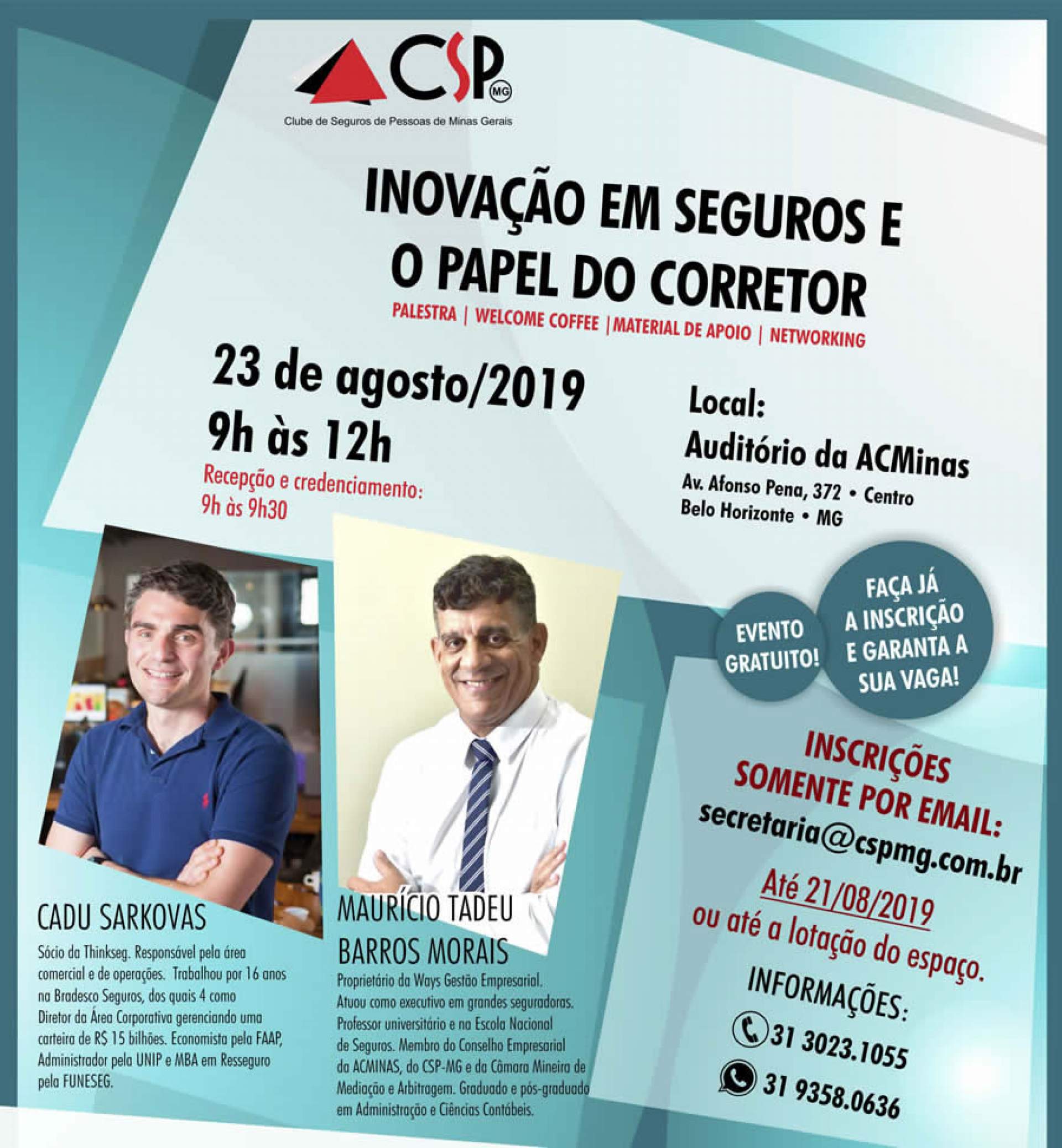 O Clube de Seguros de Pessoas de Minas Gerais (CSP-MG) promove no dia 23 de agosto, das 9 às 12 horas, em Belo Horizonte, a palestra “Inovação em Seguros e o Papel do Corretor”.