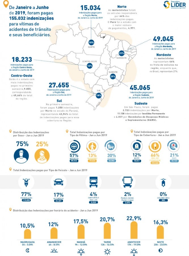 No primeiro semestre de 2019, a Seguradora Líder pagou 155.032 indenizações do Seguro DPVAT às vítimas de acidente de trânsito e seus beneficiários. Os dados fazem parte do Relatório Estatístico divulgado na última semana, mostrando que apenas nos seis primeiros meses do ano, mais de 103 mil pessoas adquiriram algum tipo de sequela permanente em decorrência de acidentes de trânsito. A cobertura continua sendo a mais solicitada, representando 66% dos pagamentos.