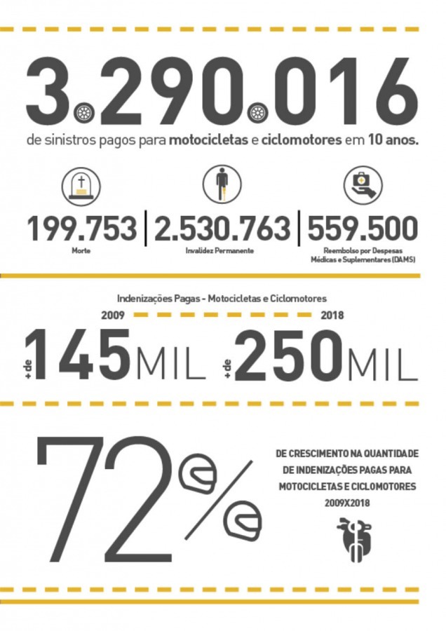 Nos últimos dez anos, o Seguro DPVAT pagou mais de 3,2 milhões de indenizações por ocorrências envolvendo motocicletas e ciclomotores. Esse é um dos números de destaque do “Relatório Motocicletas e Ciclomotores 10 Anos”, divulgado pela Seguradora Líder na última semana. O documento também mostra que quase 200 mil pessoas morreram e 2,5 milhões ficaram com algum tipo de invalidez permanente em decorrência de acidentes envolvendo as duas categorias de veículo. Na última década, esses números representaram cerca de 72% do total de pagamentos efetuados pelo seguro obrigatório, totalizando cerca de 4,5 milhões.