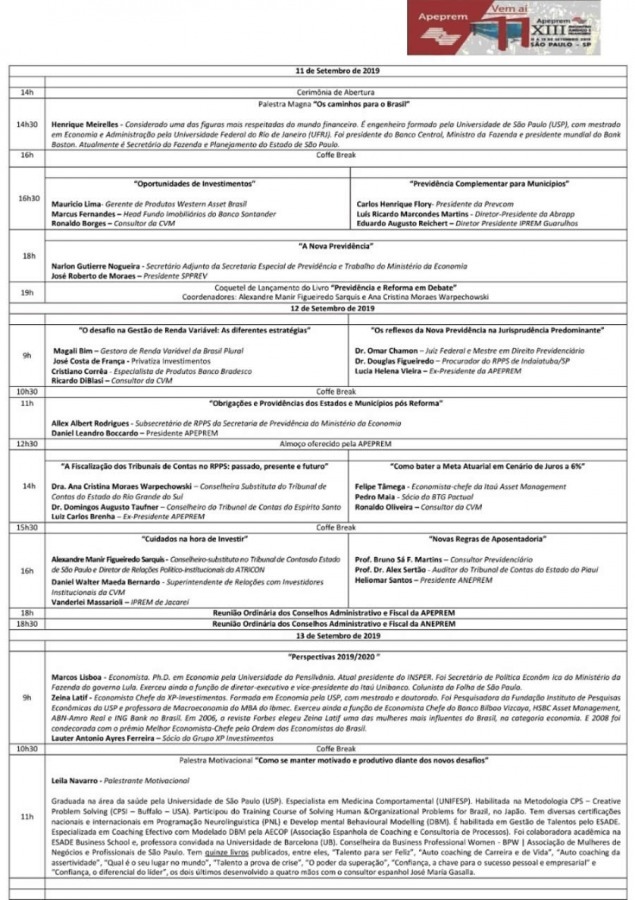O evento contará também com a participação de Narlon Gutierre Nogueira, Secretário Adjunto da Secretaria Especial de Previdência e Trabalho do Ministério da Economia, que realizará palestra sobre a "Nova Previdência", e Allex Albert Rodrigues, Subsecretário de RPPS da Secretaria de Previdência do Ministério da Economia, que falará sobre "Obrigações e Providências dos Estados e Municípios pós Reforma".
