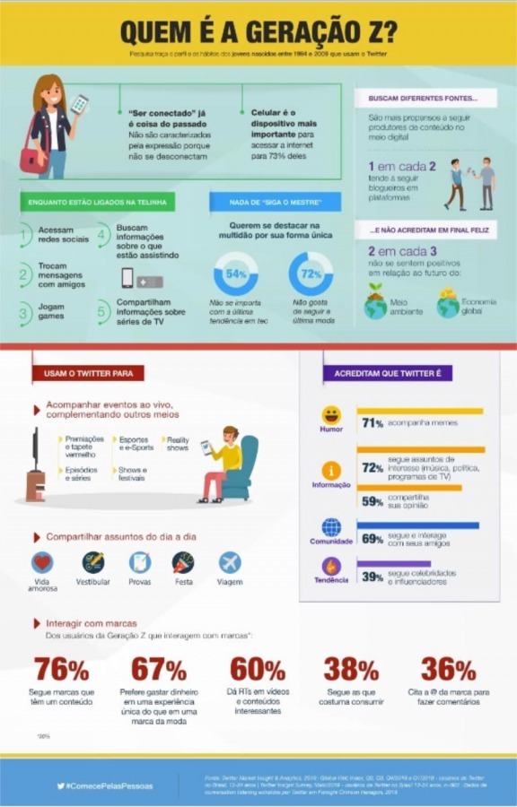 Um estudo do Twitter traz insights sobre o perfil, hábitos de consumo e interações da Geração Z, composta pelos nascidos entre 1994 e 2009, que utilizam a plataforma no Brasil. Para 73% dos entrevistados, o celular é o dispositivo mais importante para acessar a internet - e é bastante usado como complemento da televisão. Enquanto assistem à TV, eles usam o aparelho para conferir redes sociais, trocar mensagens com amigos, jogar games, buscar informações sobre o que estão assistindo e comentar sobre séries. Conforme as respostas coletadas, o estudo conclui que o Twitter é humor, informação, comunidade e tendência - essa nova geração usa a plataforma para acompanhar eventos ao vivo, compartilhar assuntos do dia a dia e interagir com marcas.