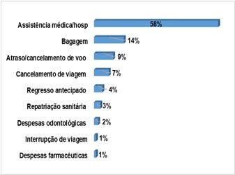 Entre as principais sinistralidades estão a assistência médica hospitalar, com 58% do total; problemas com bagagem, com 14%; atraso ou cancelamento de voo, com 9%; e cancelamento de viagem, com 7%.