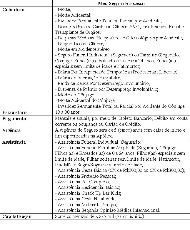 Com previsão de cobertura de até R$ 10 milhões, uma das mais elevadas do mercado, a única obrigatória é a de morte, contando com 15 possibilidades de escolhas opcionais como morte acidental, doenças graves (Cardíaca, Câncer, AVC, Insuficiência Renal e Transplante de Órgãos) , DIT (Diária por Incapacidade), Diária de Internação Hospitalar, Morte por acidente Aéreo, Perda de renda por desemprego, entre outras opções.