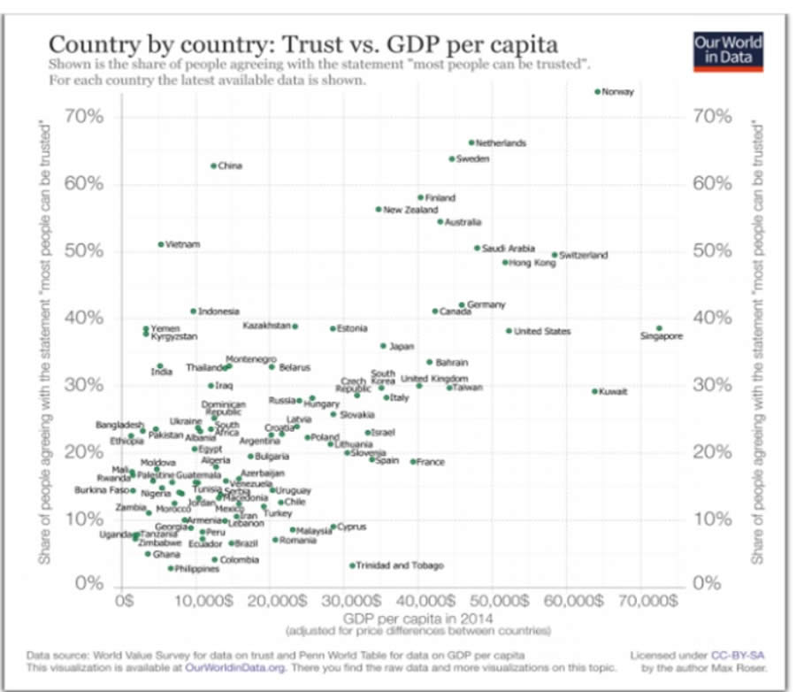 O gráfico relaciona o PIB per capta dos países com o % de pessoas em cada país que concordam com a afirmação “a maioria das pessoas pode ser confiável”.