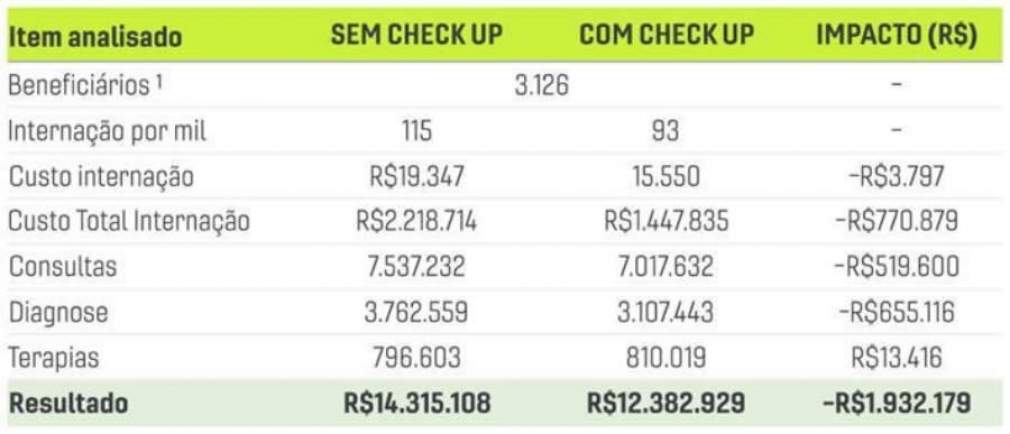 O estudo foi realizado em agosto deste ano com o objetivo de identificar o comportamento de sinistros e média de eventos, de forma comparativa, entre aqueles que realizaram ou não o checkup. Foram contemplados nesse levantamento cerca de 64 mil vidas e 15 clientes da companhia.