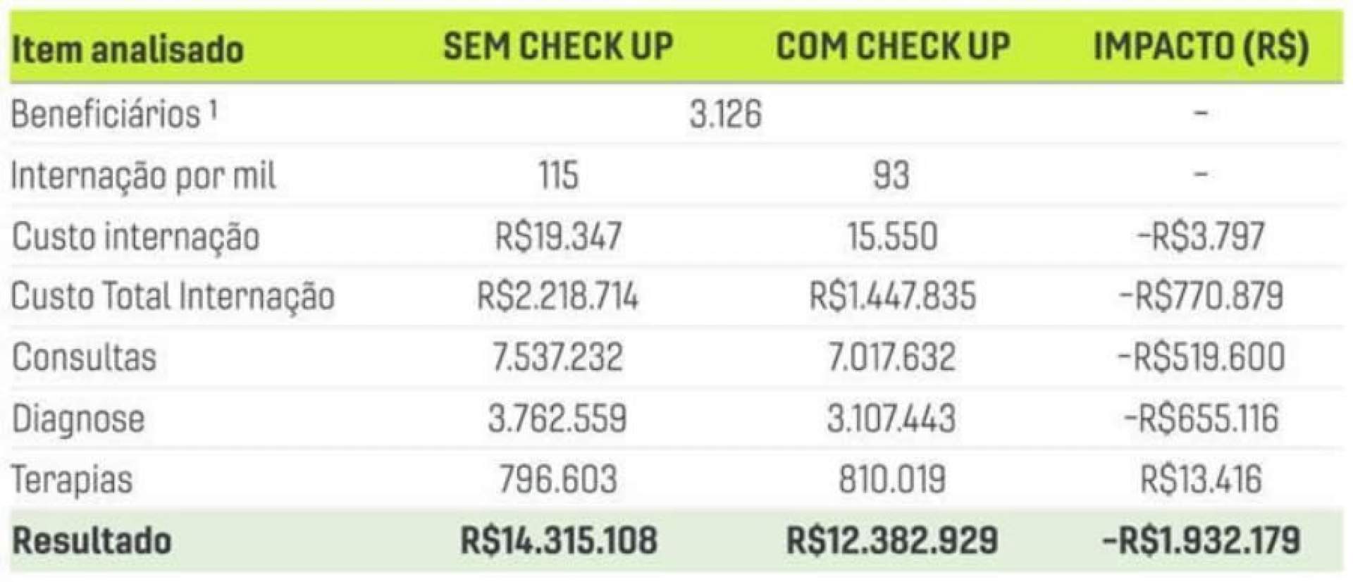 No quadro abaixo, ao avaliar o grupo elegível ao checkup (cerca de 4 mil vidas), os resultados obtidos demonstram o custo evitado de sinistro, caso integralmente esta população tivesse realizado checkup preventivo.
