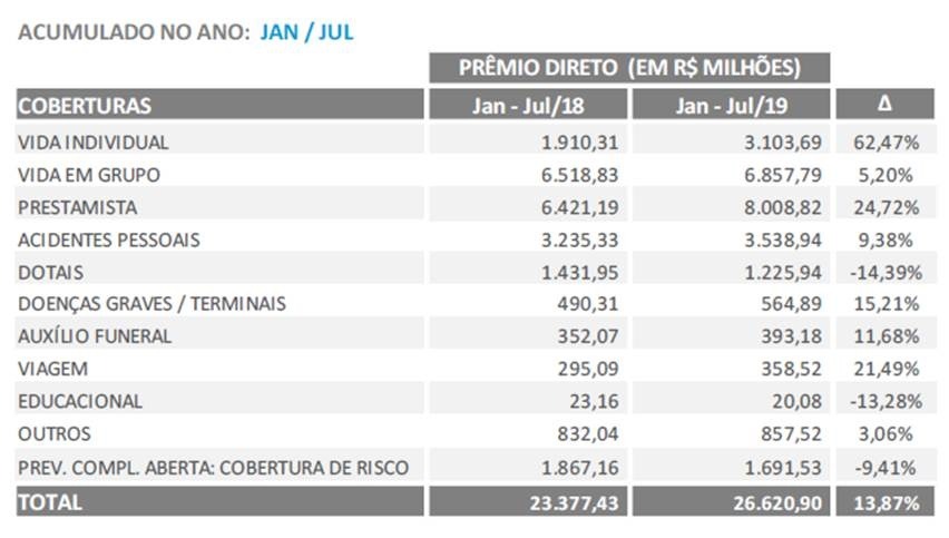 No acumulado dos sete primeiros meses do ano, o segmento de seguros de pessoas movimentou R$ 26,6 bilhões em prêmios, valor 13,87% maior que verificado em igual intervalo do ano anterior. O seguro prestamista foi a carteira que movimentou o maior volume de contratações, somando R$ 8 bilhões no período e crescimento de 24,72% no ano.