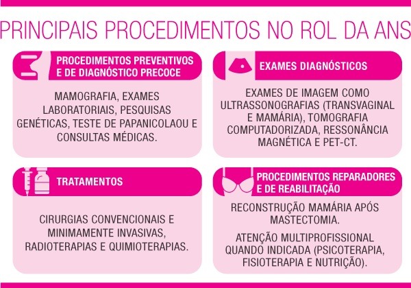 No Outubro Rosa, a Agência Nacional de Saúde Suplementar (ANS) reforça às beneficiárias de planos de saúde os procedimentos que constam no Rol de Procedimentos e Eventos em Saúde relacionados à prevenção, diagnóstico precoce e tratamento do câncer de mama e do câncer de colo do útero, bem como os procedimentos reparadores e de reabilitação. O Rol estabelece a cobertura mínima obrigatória a que beneficiários de planos de saúde têm direito.