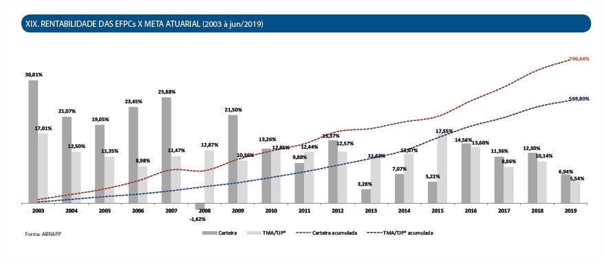 Quando considerado o longo prazo o resultado também foi positivo: a rentabilidade no acumulado (2003 a jun/19) foi de 790,44%, superior à meta atuarial do período, que foi de 569,80%.