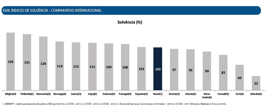Mesmo diante do cenário mais desafiador para os investimentos, o índice de solvência dos planos de previdência complementar fechada chegou a 100% em junho de 2019, compatível com padrões internacionais e superior a países como os Estados Unidos, Canadá e Reino Unido.
