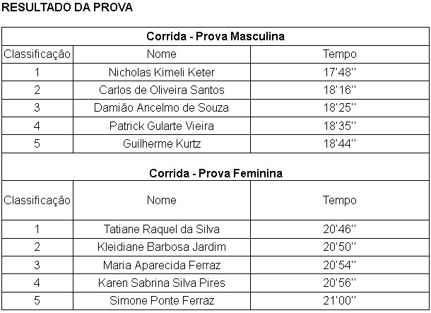 A atleta Tatiane Raquel da Silva foi a grande campeã da prova feminina, com o tempo de 20’46’’. Já entre os homens, Nicholas Kimeli Keter, subiu no lugar mais alto do pódio, com o tempo de 17’48”. O atleta Bradesco Seguros Damião Ancelmo de Souza terminou a prova em terceiro lugar, marcando 18’25’’.