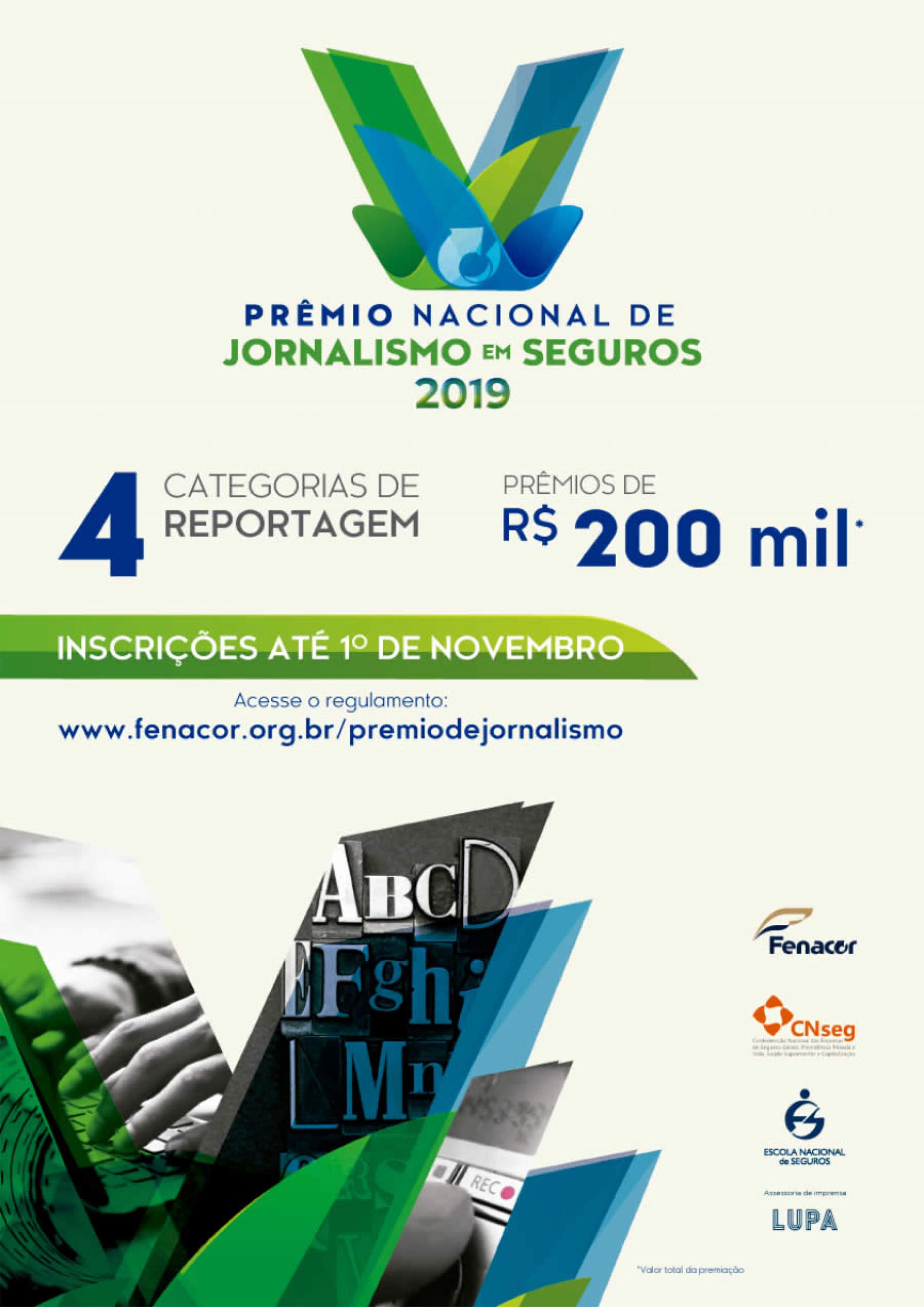 Promovido pela Federação Nacional dos Corretores de Seguros (Fenacor), com o apoio institucional da CNseg e da Escola de Negócios e Seguros (ENS), o Prêmio tem por objetivo promover a conscientização sobre oportunidades e benefícios envolvidos na contratação do seguro. Podem concorrer os trabalhos veiculados na imprensa entre 12 de novembro de 2018 e 31 de outubro de 2019. O Prêmio engloba todos os ramos de seguros, capitalização, vida, saúde suplementar, resseguros e previdência complementar aberta.