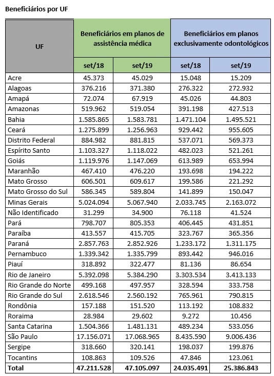 Entre setembro de 2018 e setembro de 2019, houve aumento de beneficiários em planos de assistência médica em 12 estados, sendo Minas Gerais, Goiás e Espírito Santo os líderes em números absolutos. Na segmentação odontológica, 23 estados e o DF registraram crescimento.