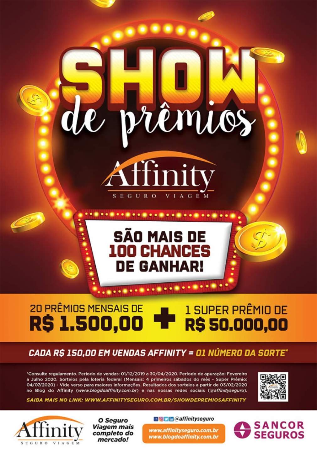 Sempre pensando nos seus parceiros comerciais – agentes de viagens e corretores de todo o Brasil - a Affinity acaba de lançar a campanha Show de Prêmios. A iniciativa que promete impactar o mercado, vai distribuir 100 prêmios de R$ 1.500 (20 por mês, durante 5 meses) e um prêmio final de R$ 50 mil. Serão ao todo R$ 200 mil em premiação.