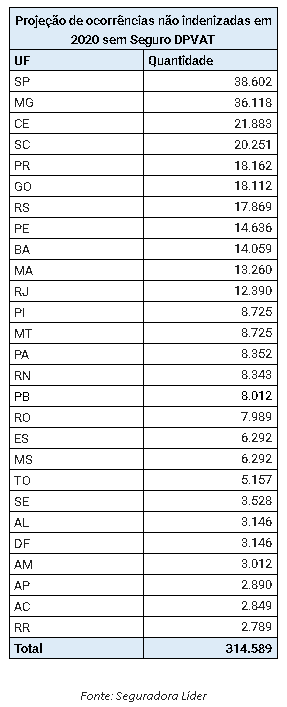 Num cenário sem o Seguro DPVAT, o Nordeste seria o mais atingido. Segundo o estudo, no ano que vem, a região concentrará a maior parte das ocorrências não indenizadas: 30% do total. Entre os estados, São Paulo, Minas Gerais, Ceará e Santa Catarina apresentarão o maior número de vítimas que ficarão sem a cobertura: 38.602, 36.118, 21.883 e 20.251, respectivamente.